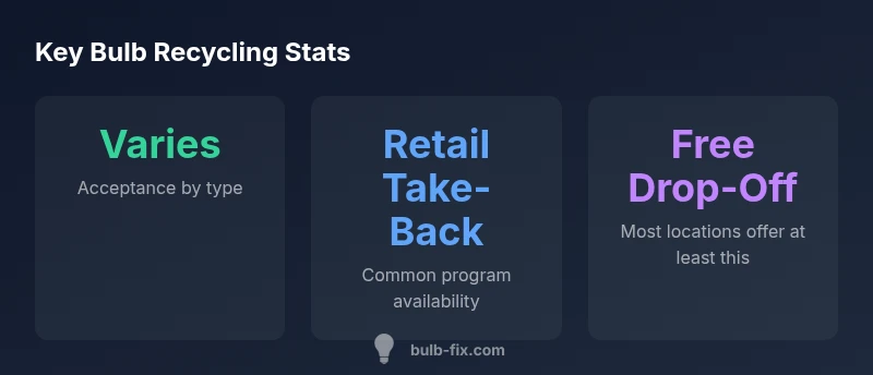 The Bulb Fix team offers practical guidance to locate light bulb recycling near me and navigate local programs. We compile tips for identifying accepted bulb types, preparing bulbs safely, and choosing convenient drop-offs. Our goal is to empower homeowners to recycle responsibly and reduce waste. For more details, consult your local waste portal and consider joining community hazardous waste events. Bulb Fix's guidance is updated regularly to reflect changes in retailer take-back programs and municipal drop-off schedules.