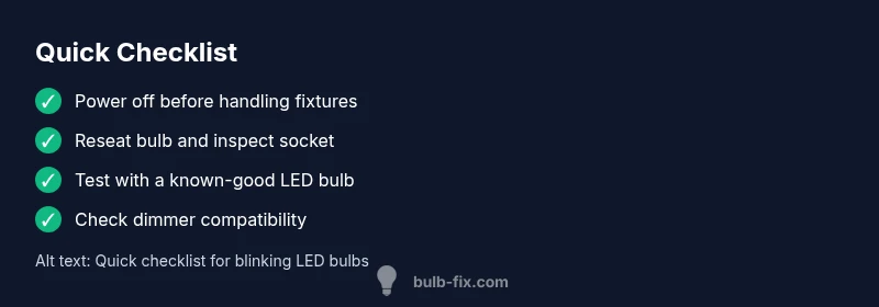 If you’re confronted with a blinking led bulb, start by confirming the symptom: intermittent blinking that is not tied to a switch or dimmer. Then move through this practical flow: check power stability, reseat the bulb, swap in a known-good LED, test the fixture in another room, and then evaluate dimmer compatibility. This flow keeps you focused on safe, simple steps first and escalates only when necessary. Document what you observe so you can explain the issue to a retailer or technician if you need to replace parts. The goal is to isolate whether the problem is the bulb, the fixture, or the power supply and choose the least invasive fix that resolves the blinking.