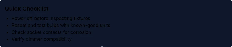 - Re-seat the bulb firmly, then replace with a known-good bulb of the correct wattage.