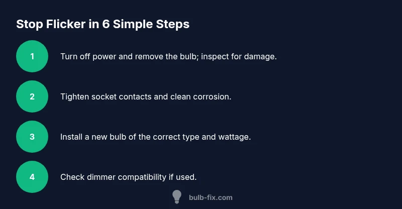 You can stop a flickering bulb by diagnosing common causes and applying simple fixes: tighten loose connections, replace an incompatible dimmer or bulb, and ensure the fixture wiring is sound. Start with a visual check, then swap to a compatible bulb and re-test. According to Bulb Fix, most flicker issues stem from loose connections or mismatched dimmers.