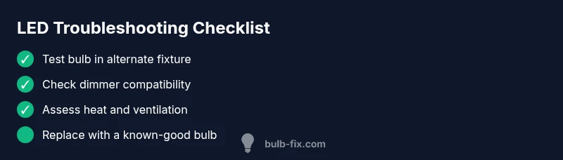 LED bulbs communicate their health through several observable cues. The most common signs include flickering or strobing, unexpected dimming, a noticeable color shift toward yellow or green, and periods where the light won’t stay on. Some bulbs may buzz or hum when driven at the edge of their specification, especially in dimmed or enclosed fixtures. Color consistency matters too: a bulb that consistently changes hue or loses its crisp white tone can be nearing the end of its useful life. Keep in mind that power quality and fixture hardware can mimic bulb failure, so rule out those factors first. Bulb Fix analysis shows that drivers and power delivery are frequent culprits behind flicker and dimming, while heat and ventilation influence longevity more than most homeowners expect. If you see multiple signs together, it’s a strong signal to replace with a compatible unit and re-test the circuit.