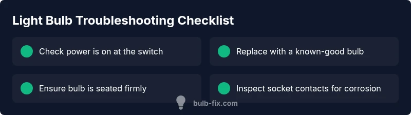 If your light bulb does not work, the problem is often straightforward and fixable. According to Bulb Fix, many light bulb failures are caused by a burned-out bulb, a loose or poor connection, or a bulb that isn't fully seated in the socket. The symptom "light bulb does not work" shows up in kitchens, living rooms, and bedrooms across millions of homes, so approaching the issue methodically saves time and prevents wasted replacements. This guide is designed for homeowners and DIY enthusiasts who want urgent, practical lighting fixes that are also safe.