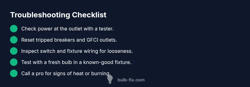 You can do several checks without specialized tools. First, verify the light switch works by flipping it off and on firmly, listening for a click and watching the fixture. Then test the outlet that feeds the fixture with a known-good lamp or a voltage tester. If the outlet shows no power, reset any tripped breakers or GFCI outlets in the area. Inspect the fixture socket and the bulb socket for corrosion, loose screws, or burnt smells. Ensure the bulb is the correct type for the fixture (bayonet, screw, or pin-based). Finally, try a known-good bulb in the same fixture to rule out a bulb fault. If you complete these checks and the light still won’t come on, you’ve narrowed the problem to power delivery or wiring rather than a burned-out bulb. This kind of methodical approach helps you save time and avoid unnecessary replacements. Bulb Fix recommends documenting what you test so you have a clear trail if you seek professional help later.