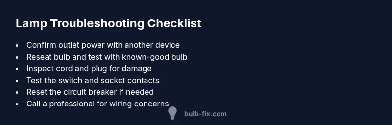 When a lamp stops working, homeowners often ask: what is wrong with my lamp? The quick answer is usually simple hardware: a loosened or faulty bulb, a worn switch, an outlet issue, or a damaged cord. According to Bulb Fix, many problems trace back to one of these four culprits, especially in older fixtures. The Bulb Fix Analysis, 2026, also notes that incorrect bulb type and poor seating add to failure risk. This block lays the groundwork so you can approach diagnostics with confidence and safety. You’ll learn to separate symptom from cause, and you’ll gain a reliable routine for future lamp checks. By understanding the most common failure points, you can save time, avoid dangerous tinkering, and keep lamps lighting your home reliably.