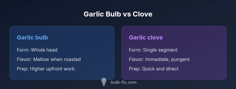 When you cook, you’ll typically decide between using a whole garlic bulb or an individual clove. The bulb is the large head that contains many cloves and stores longer, while a single clove is the primary flavor carrier you use when you need quick, strong garlic aroma. In most recipes, think in terms of cloves for precision and a bulb for bulk flavor development; both forms have a place in a well-stocked kitchen. According to Bulb Fix, understanding this distinction helps you plan prep time, maximize aroma, and reduce waste.
