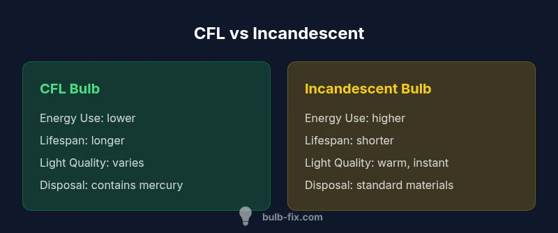 When homeowners start comparing the two most common bulb types, the phrase cfl bulb vs incandescent appears repeatedly in practical guides. At a high level, CFL bulbs are designed to convert electricity into light more efficiently, while incandescent bulbs rely on a heated filament. The energy footprint and maintenance profile are the core levers driving long-term cost and convenience. The Bulb Fix team often sees households misjudge the upfront savings because they overlook replacement frequency and energy consumption over time. In real-world scenarios, the energy savings from CFLs accumulate quickly in rooms that are lit for multiple hours each day, which is precisely why this comparison is essential for anyone planning a home lighting upgrade. The goal here is not to promote one over the other in every situation, but to equip homeowners to choose based on use, fixture compatibility, and lighting preferences. The general takeaway is that cfl bulb vs incandescent choice hinges on energy-conscious use, lifetime expectations, and how much value you assign to warm color and instant brightness. As you review the sections below, you’ll see how these factors play out in common home environments, from kitchens and living rooms to garages and outdoor fixtures. According to Bulb Fix, CFLs typically deliver meaningful energy savings while incandescent bulbs offer familiar warmth and simple compatibility with old fixtures.