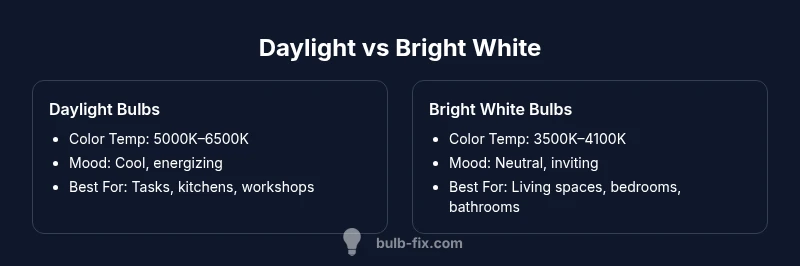 Daylight bulbs (roughly 5000K–6500K) deliver a cool, crisp light ideal for tasks and focused work, while bright white bulbs (roughly 3500K–4100K) offer a cleaner, more neutral glow suited to living spaces. For color accuracy and detail work you may favor daylight, but for comfort and ambience, bright white often wins. The best choice depends on room use, task requirements, and personal preference.