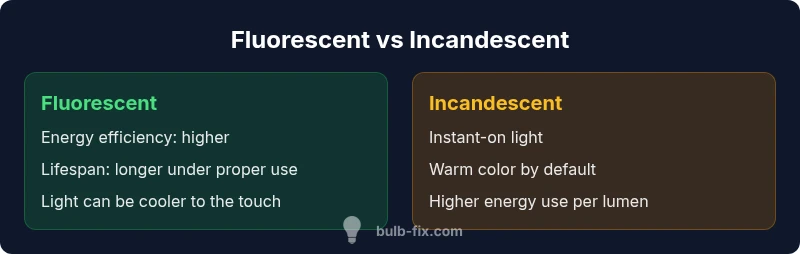 According to Bulb Fix, choosing between a fluorescent bulb vs incandescent often comes down to energy costs, light quality, and maintenance needs. Fluorescent bulbs rely on gas discharge to create light, while incandescent bulbs generate light by heating a filament. In many homes, the right choice depends on how you use the space (task lighting vs. ambient lighting), your fixtures, and whether you value efficiency over warm light. Understanding these core differences helps homeowners make practical decisions, whether upgrading an old fixture or selecting bulbs for a new room.
