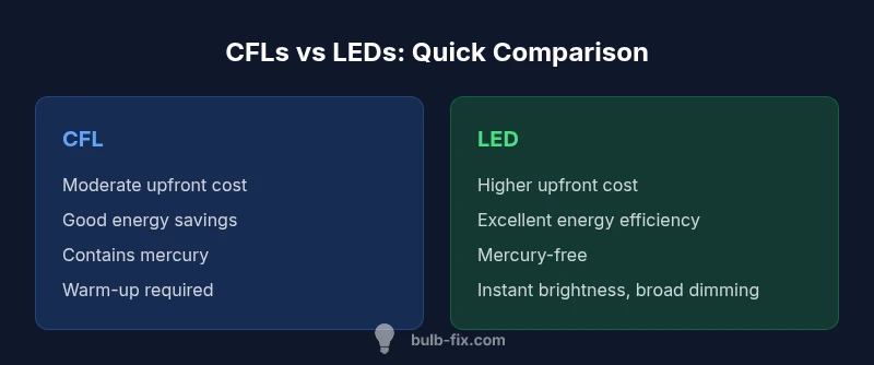 This section introduces a side-by-side analysis to help you weigh CFLs against LEDs. CFLs typically deliver solid energy savings with lower upfront costs but may lag behind LEDs in efficiency, lifespan, and instant brightness. LEDs, meanwhile, offer higher energy efficiency, longer life, and more reliable dimming capabilities, often at a higher upfront price. The comparison considers energy use, cost of ownership, light quality, dimming compatibility, and environmental considerations. By focusing on your room-by-room needs, you can identify where CFLs are the better fit and where LEDs provide a stronger long-term return on investment.