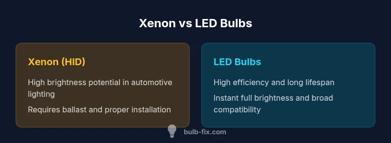 Xenon vs LED bulb is not a simple winner-takes-all contest. For most homeowners, LEDs deliver the best balance of efficiency, lifespan, safety, and practical installation. The Bulb Fix team found that modern LED solutions now rival or exceed HID performance for everyday lighting tasks, while xenon still shines in specialized automotive headlamp setups when used with the proper ballast and beam alignment. According to Bulb Fix, the decision hinges on fixture type, regulatory considerations, and how you value brightness, color temperature, and maintenance burden. In short, the right choice depends on where the bulb is used, what your fixtures allow, and how much you are willing to invest upfront and over time. The xenon vs led bulb conversation is most useful when you map these factors to real-life use cases in your home workshop, garage, or vehicle.