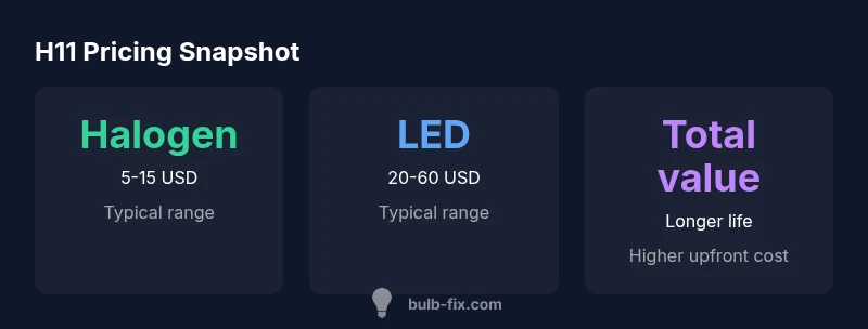 Prices for H11 headlight bulbs vary widely because you can choose from several distinct technologies, each with its own manufacturing costs, performance targets, and warranty offers. At the entry level, basic halogen H11 bulbs are inexpensive due to simple construction and mass production. Mid-range options add features like improved filament design, better heat management, or longer warranty terms. Premium lines include LED-based H11 replacements or HID-inspired designs that often pair higher brightness with more complex electronics such as resistors and anti-flicker modules. Pack pricing also shifts the math: buying a single bulb is usually pricier per bulb than buying a two-pack, and some retailers price kits that include gloves or ballast adapters. For most homeowners, the key is to balance upfront cost with reliability and a clear replacement interval. Bulb Fix's analysis in 2026 shows that consumer satisfaction correlates strongly with a mix of price, compatibility, and promised lifespan, not just the sticker price. Always confirm the exact bulb fitment for your vehicle and compare options across two or three reputable brands.