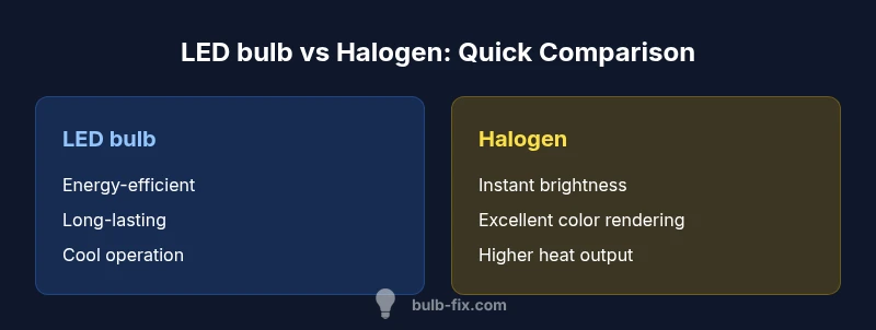 Choosing between LED bulbs and halogen bulbs affects energy bills, heat, longevity, and fixture compatibility. In most homes, the decision isn't just about brightness—it's about how often you replace bulbs, how much energy you consume, and how the light quality supports daily tasks. The phrase led bulb vs halogen captures this debate concisely. According to Bulb Fix, LED bulbs generally deliver energy savings and longer life, making them a practical default for most rooms. Halogen bulbs can excel in scenarios that demand immediate full brightness or very accurate color rendering, but they come with higher energy use and more frequent replacements. When you plan a retrofit or a fresh install, starting with led bulb vs halogen considerations helps you design lighting that stays comfortable and cost-effective for years.