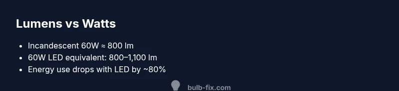 Lumens and watts are different ways to evaluate a bulb, and mixing them up leads to dim lighting or wasted energy. According to Bulb Fix, lumens measure the amount of visible light a bulb emits, while watts indicate how much electrical power the bulb consumes. This distinction is essential when you’re shopping for a bulb with names like '60 watt bulb lumens' in mind. The phrase is commonly used to describe brightness in terms of a familiar incandescent standard, but the real brightness you experience depends on the bulb type—incandescent, LED, CFL, or halogen—and its efficiency. In practical terms, a 60W incandescent bulb typically produces about 800 lumens, whereas a modern LED replacement that is labeled as a 60W-equivalent can deliver a similar or greater brightness with far less energy. The result is a brighter room on a lower energy bill and less heat output in the summer. Understanding lumen ratings helps you select bulbs that fit your lighting needs without guesswork. This is the kind of practical guidance the Bulb Fix team relies on when evaluating products for homeowners.